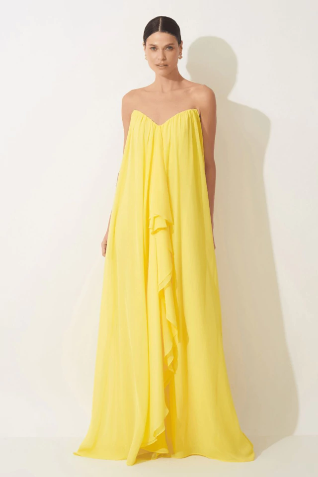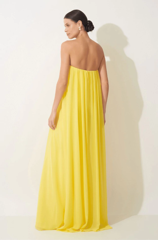 Descubra a elegância do Vestido Longo Mia Amarelo, confeccionado em tecido chiffon leve e fluido, perfeito para ocasiões especiais. Seu caimento suave valoriza a silhueta, enquanto o tom amarelo vibrante traz um toque de frescor e sofisticação ao seu visual.